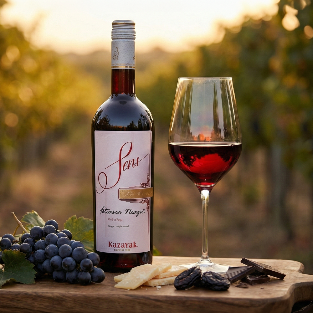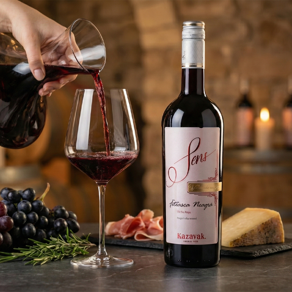This Feteasca Neagra is a refined red wine with a deep ruby hue and an elegant, expressive character. The nose opens with ripe blackberry, plum and sweet cherry, lifted by subtle, well-integrated oak tones. On the palate it is smooth and generous, revealing flavours of raspberry preserve, raisins and a touch of dark chocolate. The finish is long, noble and memorable, leaving a warm, polished impression. Best enjoyed slightly cool, at around 15-18°C, to highlight its fruit and balance. A beautiful choice for special occasions or an intimate dinner.