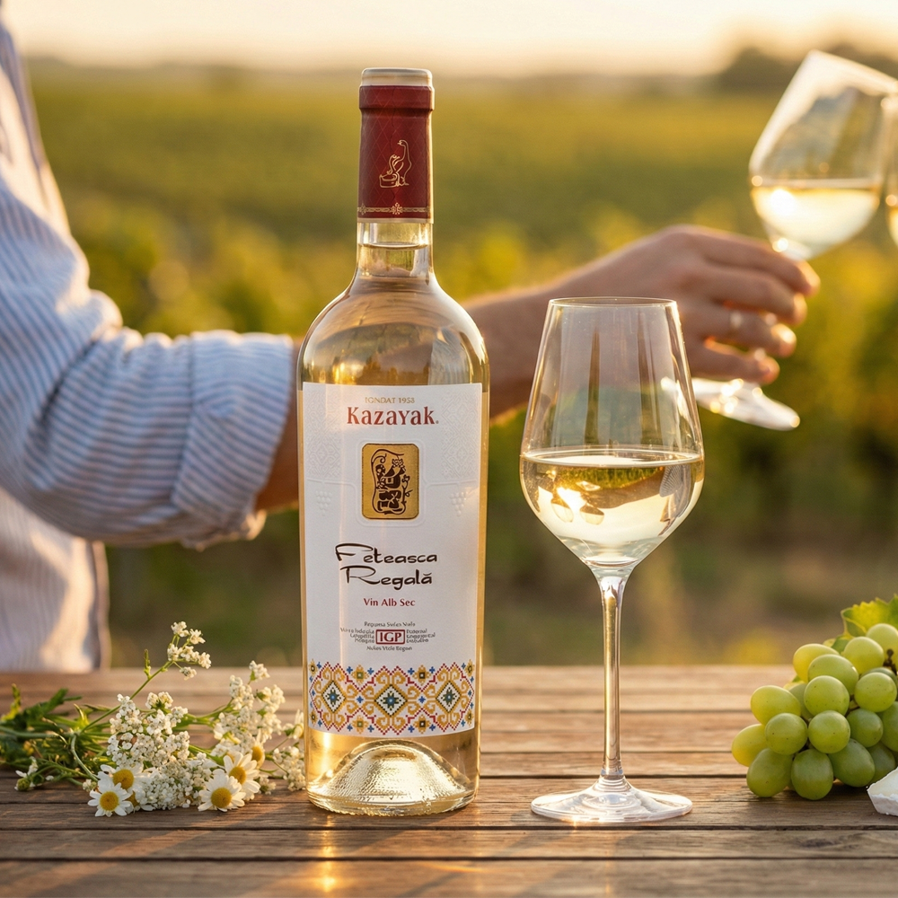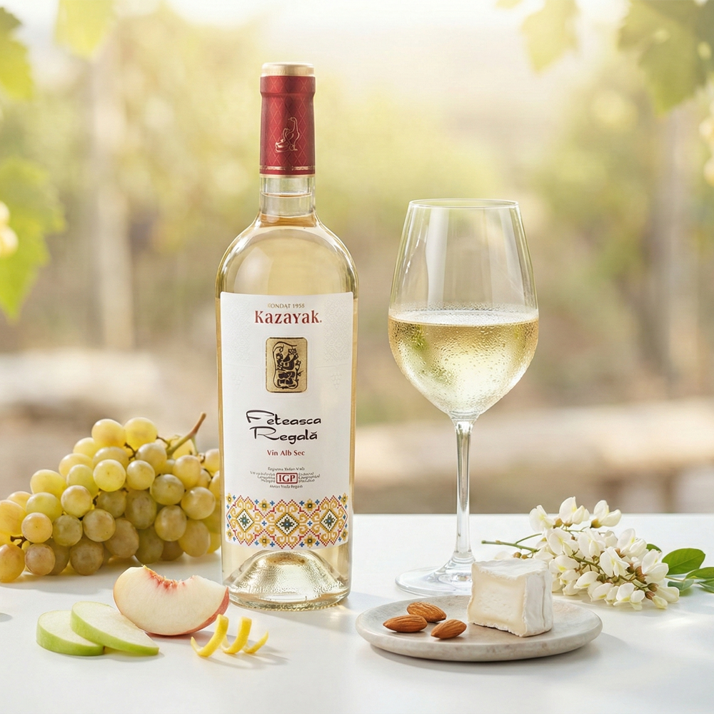 Feteasca Regala is a dry white wine with a bright yellow-green hue and a fresh, inviting character. The nose is lively and floral, with hints of spring blossoms and a delicate touch of acacia honey. On the palate it feels clean and vibrant, carried by a crisp acidity that keeps it beautifully balanced. Subtle wildflower tones mingle with gentle stone-fruit flavours, especially ripe apricot. The finish is smooth and fruity, leaving a light, elegant aftertaste. Best enjoyed well chilled at 10–12°C, it suits special occasions and refined gatherings.